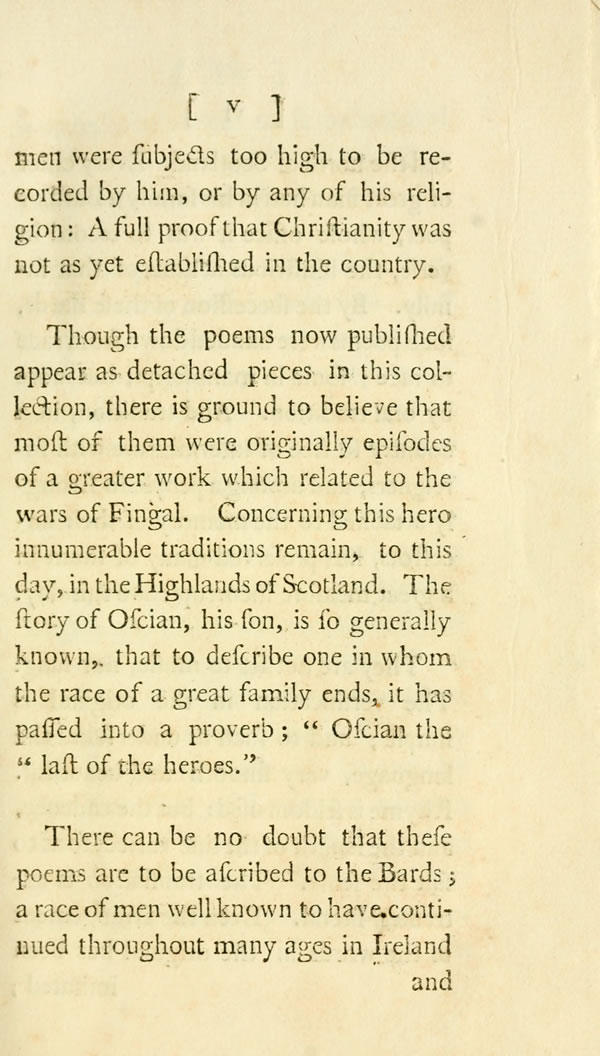 Though the poems now published appear as detached pieces in this collection, there is ground to believe that most of them were originally episodes of a greater work which related to the wars of Fingal. Concerning this hero innumerable traditions remain, to this day, in the Highlands of Scotland. The story of Oscian, his son, is so generally known, that to describe one in whom the race of a great family ends, it has passed into a proverb; "Oscian the last of the heroes."