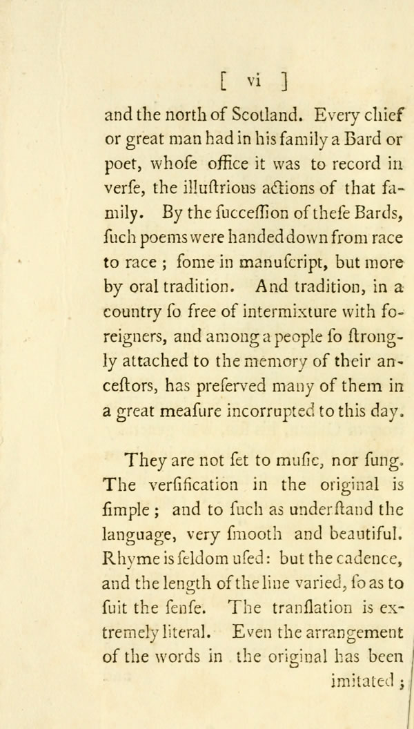 There can be no doubt that these poems are to be ascribed to the Bards; a race of men well known to have continued throughout many ages in Ireland [ vi ] View Page Image and the north of Scotland. Every chief or great man had in his family a Bard or poet, whose office it was to record in verse, the illustrious actions of that family. By the succession of these Bards, such poems were handed down from race to race; some in manuscript, but more by oral tradition. And tradition, in a country so free of intermixture with foreigners, and among a people so strongly attached to the memory of their ancestors, has preserved many of them in a great measure incorrupted to this day.