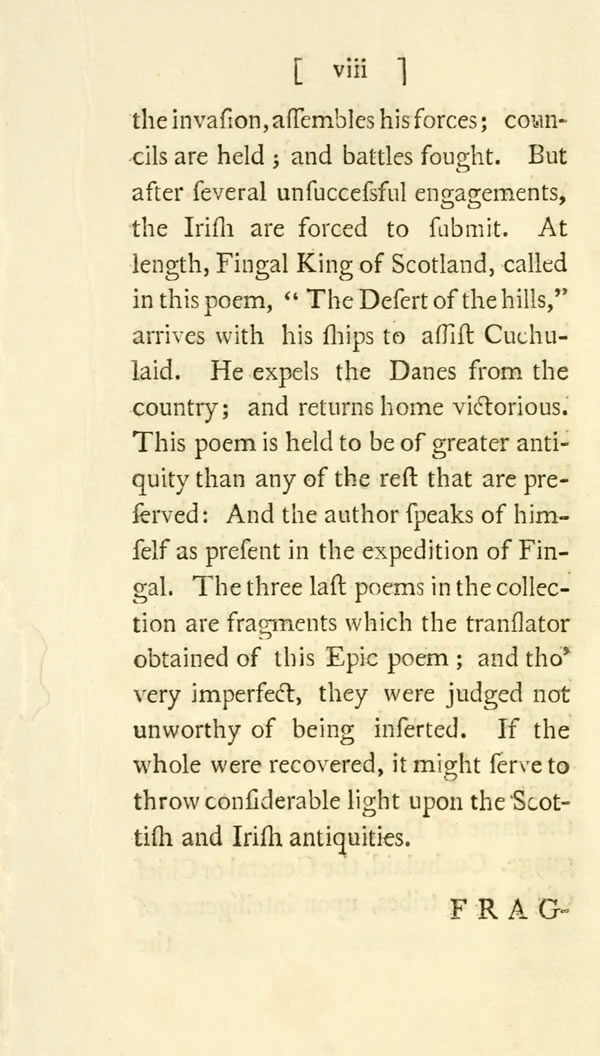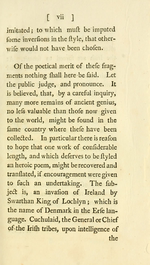 Of the poetical merit of these fragments nothing shall here be said. Let the public judge, and pronounce. It is believed, that, by a careful inquiry, many more remains of ancient genius, no less valuable than those now given to the world, might be found in the same country where these have been collected. In particular there is reason to hope that one work of considerable length, and which deserves to be styled an heroic poem, might be recovered and translated, if encouragement were given to such an undertaking. The subject is, an invasion of Ireland by Swarthan King of Lochlyn; which is the name of Denmark in the Erse language. Cuchulaid, the General or Chief of the Irish tribes, upon intelligence of [ viii ] View Page Image the invasion, assembles his forces; councils are held; and battles fought. But after several unsuccessful engagements, the Irish are forced to submit. At length, Fingal King of Scotland, called in this poem, "The Desert of the hills," arrives with his ships to assist Cuchulaid. He expels the Danes from the country; and returns home victorious. This poem is held to be of greater antiquity than any of the rest that are preserved: And the author speaks of himself as present in the expedition of Fingal. The three last poems in the collection are fragments which the translator obtained of this Epic poem; and tho' very imperfect, they were judged not unworthy of being inserted. If the whole were recovered, it might serve to throw considerable light upon the Scottish and Irish antiquities.