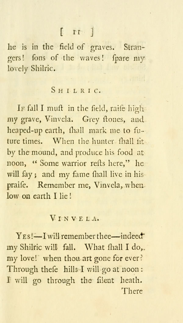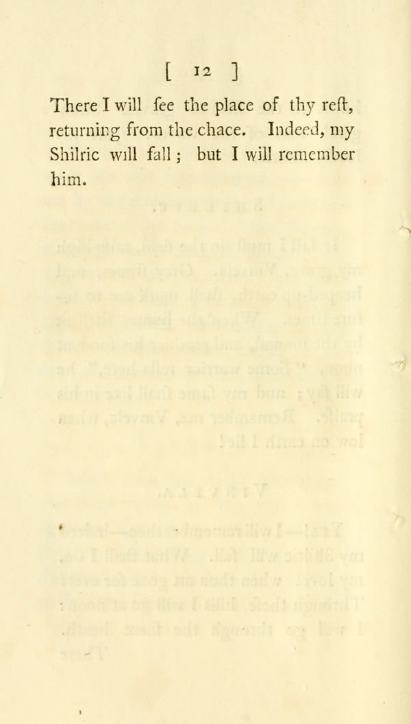 Yes!—I will remember thee—indeed my Shilric will fall. What shall I do, my love! when thou art gone for ever? Through these hills I will go at noon: I will go through the silent heath. [ 12 ] View Page Image There I will see the place of thy rest, returning from the chace. Indeed, my Shilric will fall; but I will remember him.