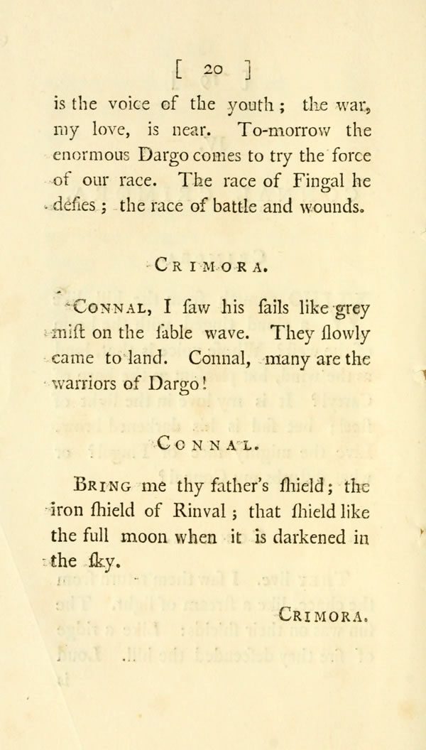 They live. I saw them return from the chace, like a stream of light. The sun was on their shields: Like a ridge of fire they descended the hill. Loud [ 20 ] View Page Image is the voice of the youth; the war, my love, is near. To-morrow the enormous Dargo comes to try the force of our race. The race of Fingal he defies; the race of battle and wounds.