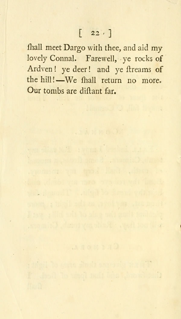 Then give me those arms of light; that sword, and that spear of steel. I [ 22 ] View Page Image shall meet Dargo with thee, and aid my lovely Connal. Farewell, ye rocks of Ardven! ye deer! and ye streams of the hill!—We shall return no more. Our tombs are distant far.
