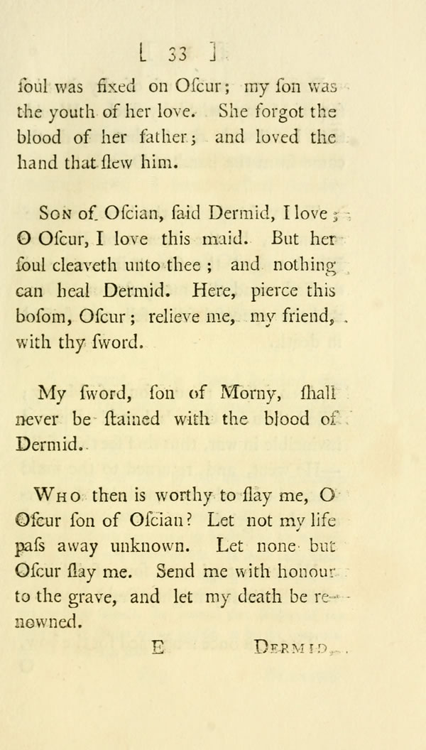 Son of Oscian, said Dermid, I love; O Oscur, I love this maid. But her soul cleaveth unto thee; and nothing can heal Dermid. Here, pierce this bosom, Oscur; relieve me, my friend, with thy sword.