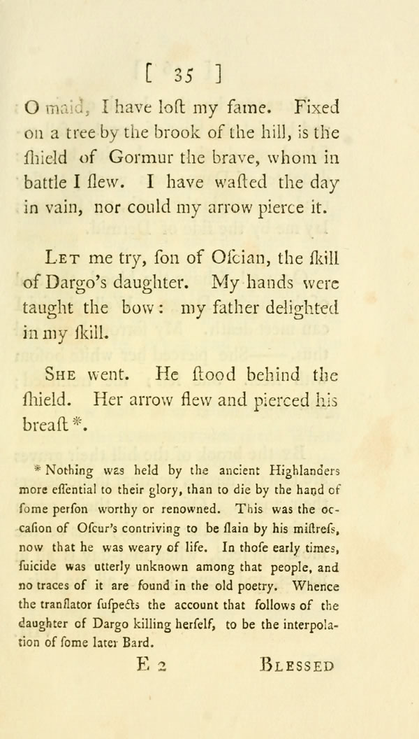 Though once renowned for the bow, [ 35 ] View Page Image O maid, I have lost my fame. Fixed on a tree by the brook of the hill, is the shield of Gormur the brave, whom in battle I slew. I have wasted the day in vain, nor could my arrow pierce it.