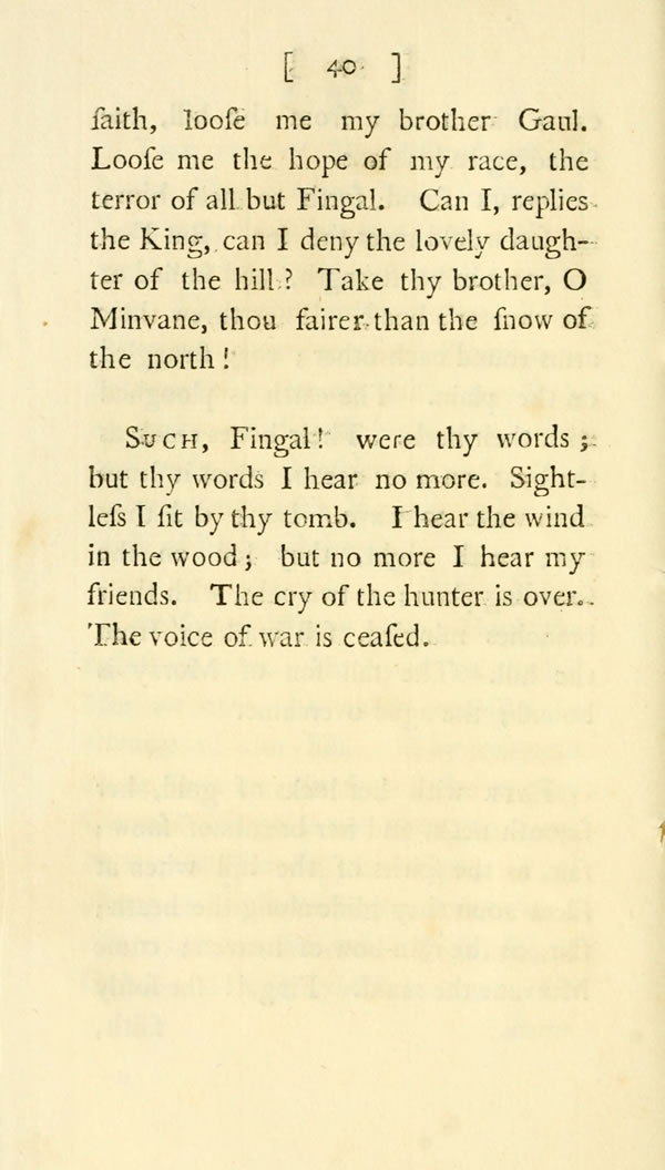 What voice is that I hear? that voice like the summer-wind. ——I sit not by the nodding rushes; I hear not the fount of the rock. Afar, Vinvela, afar I go to the wars of Fingal. My dogs attend me no more. No more I tread the hill. No more from on high I see thee, fair-moving by the stream of the plain; bright as the bow of heaven; as the moon on the western wave.