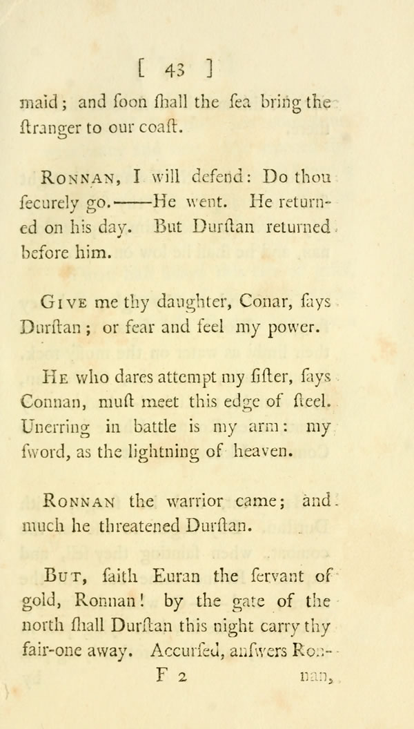 Aodan saw the fall of Muirnin, and drew the sounding bow: The grey-winged arrow flew, and pierced the breast of Fear-comhraic. Aodan, said Fear-comhraic, where was the sword of war? where was the spear of thy strength, when thus thou hast slain Fear-comhraic? Raise, gloomy youth, raise thou our tombs! I will rest with the chief of Innisfhallin.