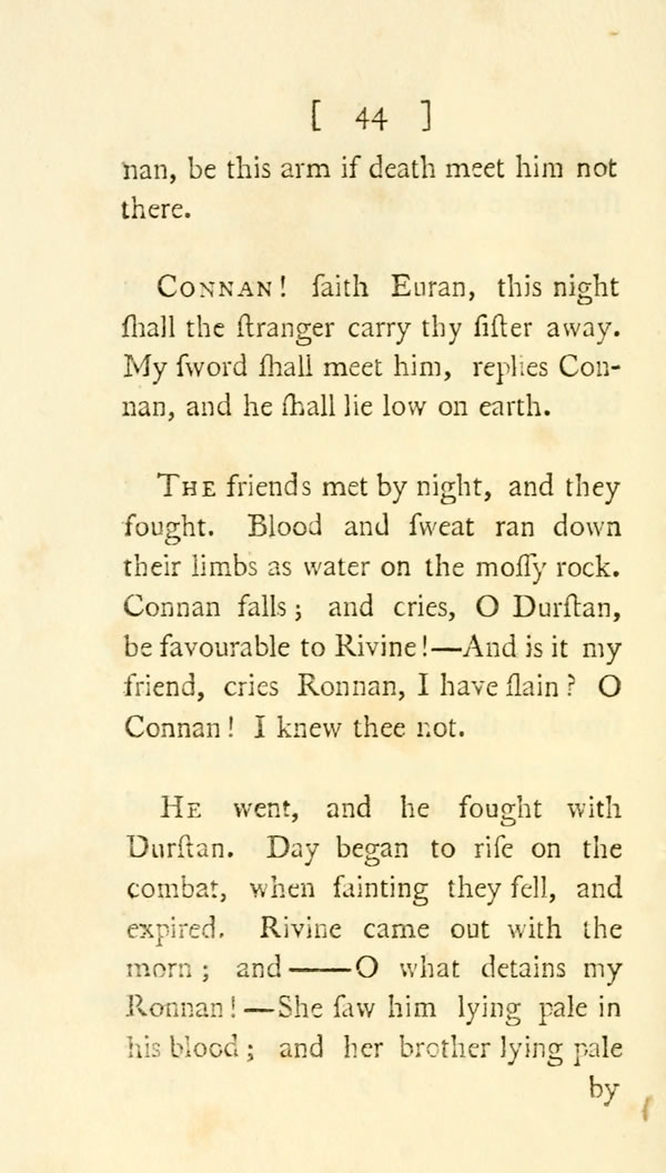 The daughter of Rinval was near; Crimora, bright in the armour of man; her hair loose behind, her bow in her hand. She followed the youth to the war, Connal her much beloved. She drew the string on Dargo; but erring, pierced her Connal. He falls like an oak on the plain; like a rock from the shaggy hill. What shall she do, hapless maid!—He bleeds; her Connal dies. All the night long she cries, and all the day, O Connal, my love, and my friend! With grief the sad mourner died.