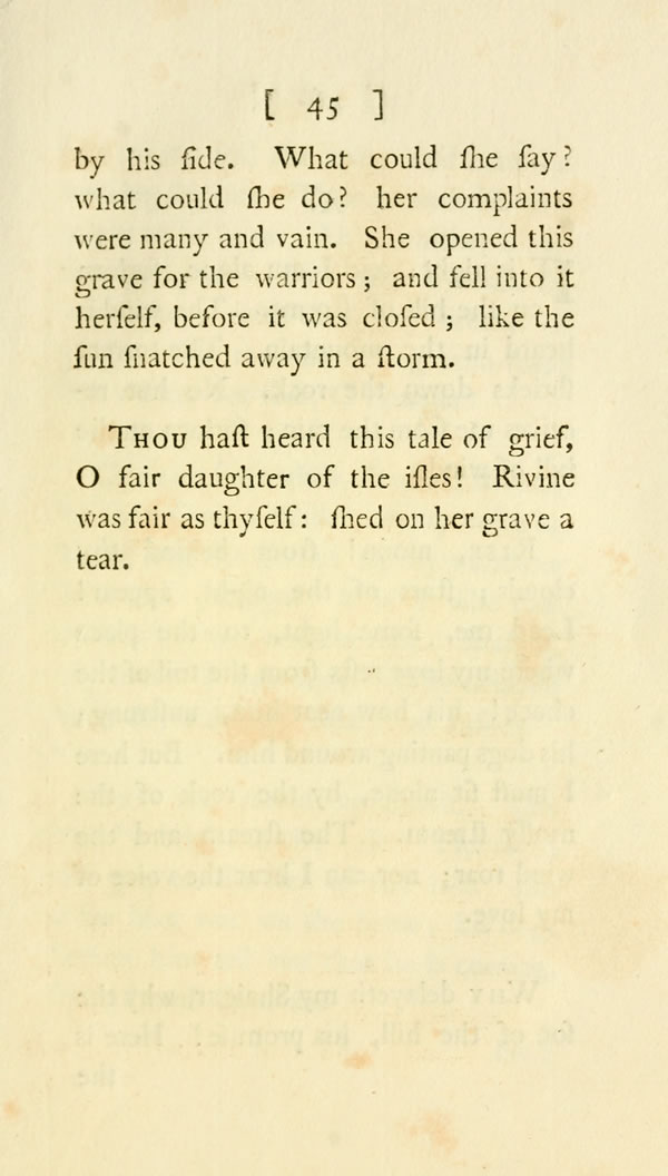 Oscur my son came down; the mighty in battle descended. His armour rattled as thunder; and the lightning of his eyes was terrible. There, was the clashing of swords; there, was the voice of steel. They struck and they thrust; they digged for death with their swords. But death was distant far, and delayed to come. The sun began to decline; and the cow-herd thought of home. Then Oscur's keen steel found the heart of Ullin. He fell like a mountain-oak covered over with glistering frost: He shone like a rock on the plain.——Here the daughter of beauty lieth; and here the bravest of men. Here one day ended the fair and the valiant. Here rest the pursuer and the pursued.