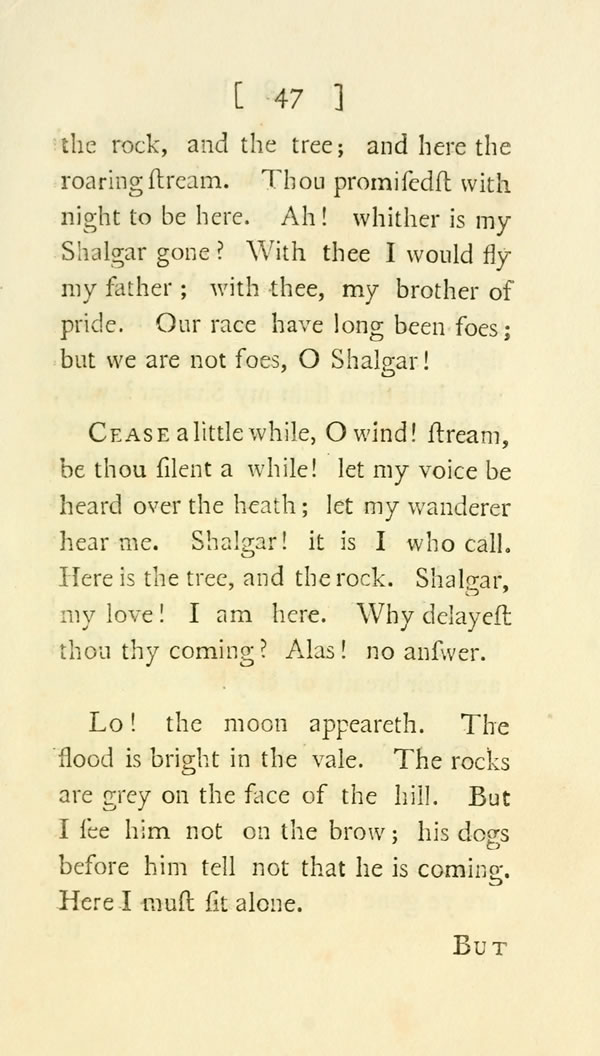 But who are these that lie beyond me on the heath? Are they my love and my brother?—Speak to me O my friends! they answer not. My soul is tormented with fears.——Ah! they are dead. Their swords are red from the fight. O my brother! my brother! why hast thou slain my Shalgar? why, O Shalgar! hast thou slain my brother? Dear were ye both to me! what shall I say in your praise? Thou wert fair on the hill among thousands; he was terrible in fight . Speak to me; hear my voice, sons of my love! But alas! they are silent; silent for ever! Cold are their breasts of clay!
