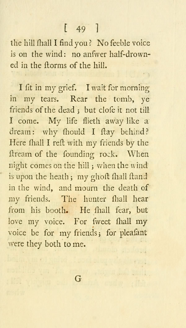 Oh! from the rock of the hill; from the top of the mountain of winds, speak ye ghosts of the dead! speak, and I will not be afraid.——Whither are ye gone to rest? In what cave of [ 49 ] View Page Image the hill shall I find you? No feeble voice is on the wind: no answer half-drowned in the storms of the hill.