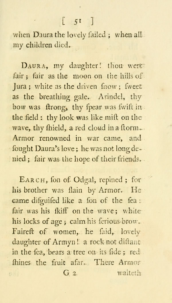 Daura, my daughter! thou wert fair; fair as the moon on the hills of Jura; white as the driven snow; sweet as the breathing gale. Arindel, thy bow was strong, thy spear was swift in the field: thy look was like mist on the wave, thy shield, a red cloud in a storm. Armor renowned in war came, and sought Daura's love; he was not long denied; fair was the hope of their friends.