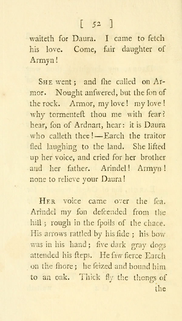 She went; and she called on Armor. Nought answered, but the son of the rock. Armor, my love! my love! why tormentest thou me with fear? hear, graceful son of Ardnart, hear: it is Daura who calleth thee !—Earch the traitor fled laughing to the land. She lifted up her voice, and cried for her brother and her father. Arindel! Armyn! none to relieve your Daura!