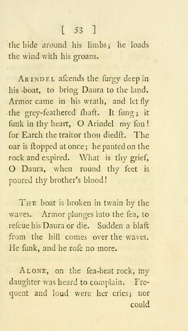 Arindel ascends the surgy deep in his boat, to bring Daura to the land. Armor came in his wrath, and let fly the grey-feathered shaft. It sung; it sunk in thy heart, O Arindel my son! for Earch the traitor thou diedst. The oar is stopped at once; he panted on the rock and expired. What is thy grief, O Daura, when round thy feet is poured thy brother's blood!