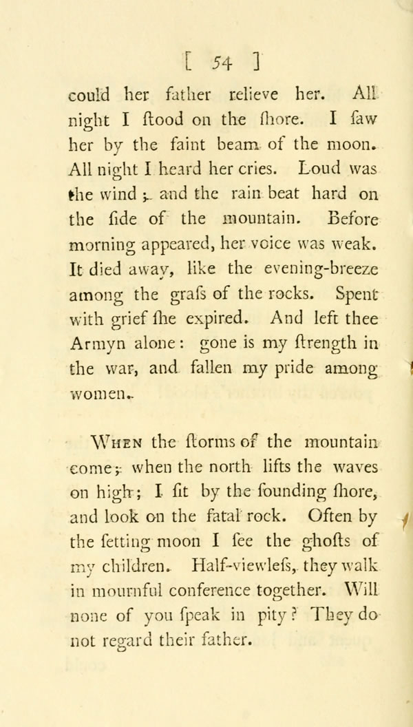 Alone, on the sea-beat rock, my daughter was heard to complain. Frequent and loud were her cries; nor [ 54 ] View Page Image could her father relieve her. All night I stood on the shore. I saw her by the faint beam of the moon. All night I heard her cries. Loud was the wind; and the rain beat hard on the side of the mountain. Before morning appeared, her voice was weak. It died away, like the evening-breeze among the grass of the rocks. Spent with grief she expired. And left thee Armyn alone: gone is my strength in the war, and fallen my pride among women.