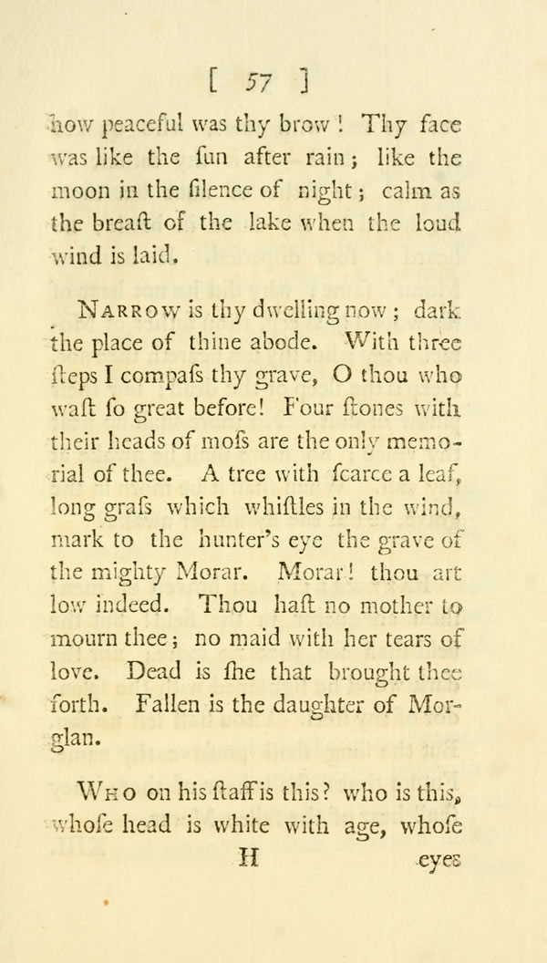 Narrow is thy dwelling now; dark the place of thine abode. With three steps I compass thy grave, O thou who wast so great before! Four stones with their heads of moss are the only memorial of thee. A tree with scarce a leaf, long grass which whistles in the wind, mark to the hunter's eye the grave of the mighty Morar. Morar! thou art low indeed. Thou hast no mother to mourn thee; no maid with her tears of love. Dead is she that brought thee forth. Fallen is the daughter of Morglan.