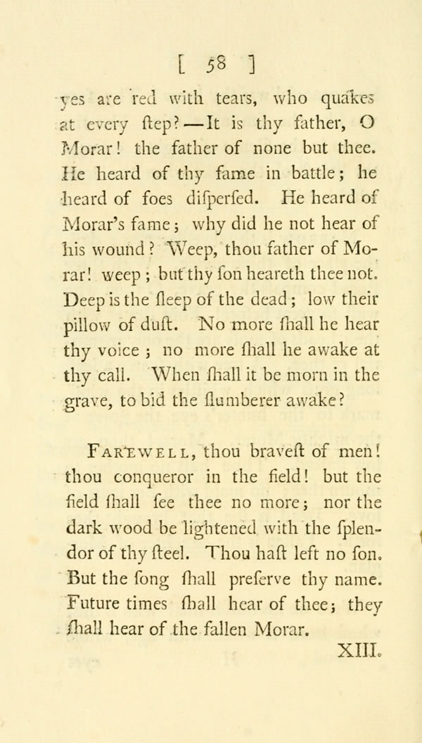 Farewell, thou bravest of men! thou conqueror in the field! but the field shall see thee no more; nor the dark wood be lightened with the splendor of thy steel. Thou hast left no son. But the song shall preserve thy name. Future times shall hear of thee; they shall hear of the fallen Morar.