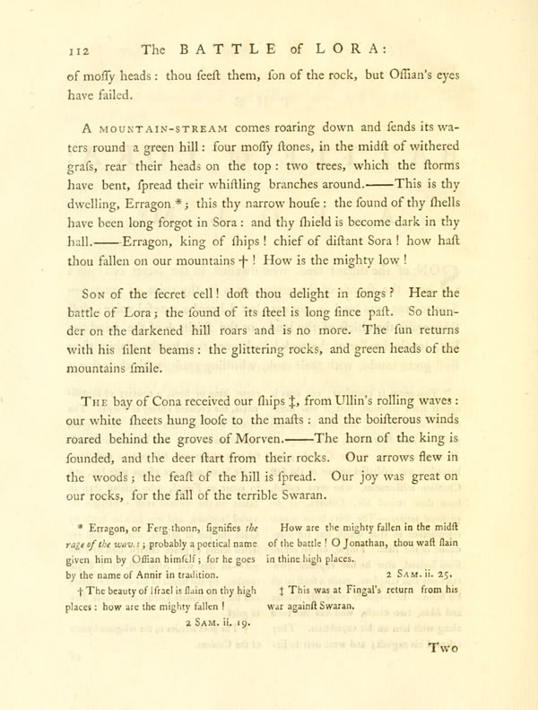 A mountain-stream comes roaring down and sends its waters round a green hill: four mossy stones, in the midst of withered grass, rear their heads on the top: two trees, which the storms have bent, spread their whistling branches around.——This is thy dwelling, ErragonDisplay note; this thy narrow house: the sound of thy shells have been long forgot in Sora: and thy shield is become dark in thy hall.——Erragon, king of ships! chief of distant Sora! how hast thou fallen on our mountainsDisplay note! How is the mighty low!
