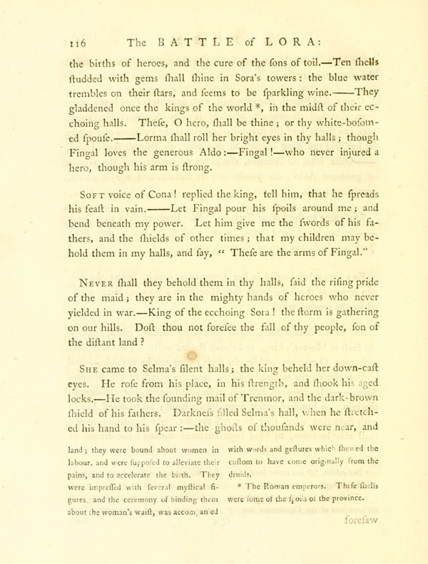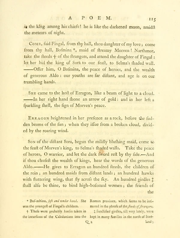 Come, said Fingal, from thy hall, thou daughter of my love; come from thy hall, BosminaDisplay note, maid of streamy Morven! Narthmor, take the steedsDisplay note of the strangers, and attend the daughter of Fingal: let her bid the king of Sora to our feast, to Selma's shaded wall.——Offer him, O Bosmina, the peace of heroes, and the wealth of generous Aldo: our youths are far distant, and age is on our trembling hands.