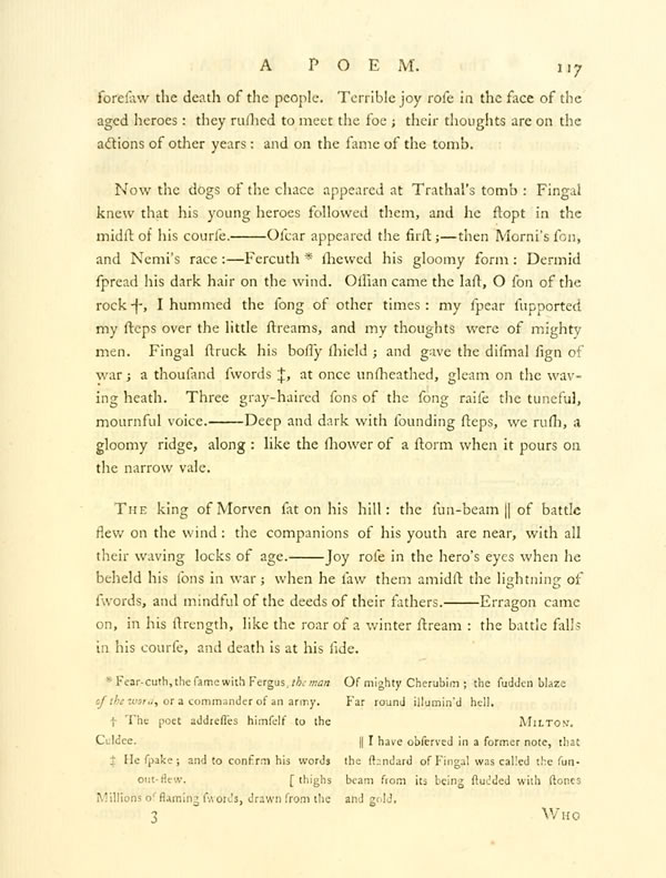 Now the dogs of the chace appeared at Trathal's tomb: Fingal knew that his young heroes followed them, and he stopt in the midst of his course.——Oscar appeared the first;—then Morni's son, and Nemi's race:—FercuthDisplay note shewed his gloomy form: Dermid spread his dark hair on the wind. Ossian came the last, O son of the rockDisplay note, I hummed the song of other times: my spear supported my steps over the little streams, and my thoughts were of mighty men. Fingal struck his bossy shield; and gave the dismal sign of war; a thousand swordsDisplay note, at once unsheathed, gleam on the waving heath. Three gray-haired sons of the song raise the tuneful, mournful voice.——Deep and dark with sounding steps, we rush, a gloomy ridge, along: like the shower of a storm when it pours on the narrow vale.
