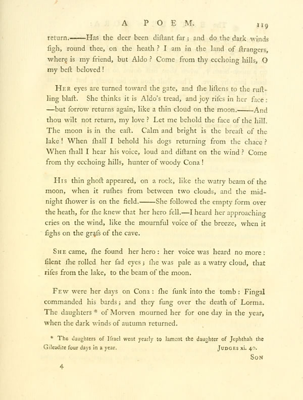 Few were her days on Cona: she sunk into the tomb: Fingal commanded his bards; and they sung over the death of Lorma. The daughtersDisplay note of Morven mourned her for one day in the year, when the dark winds of autumn returned.