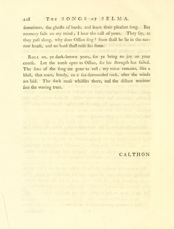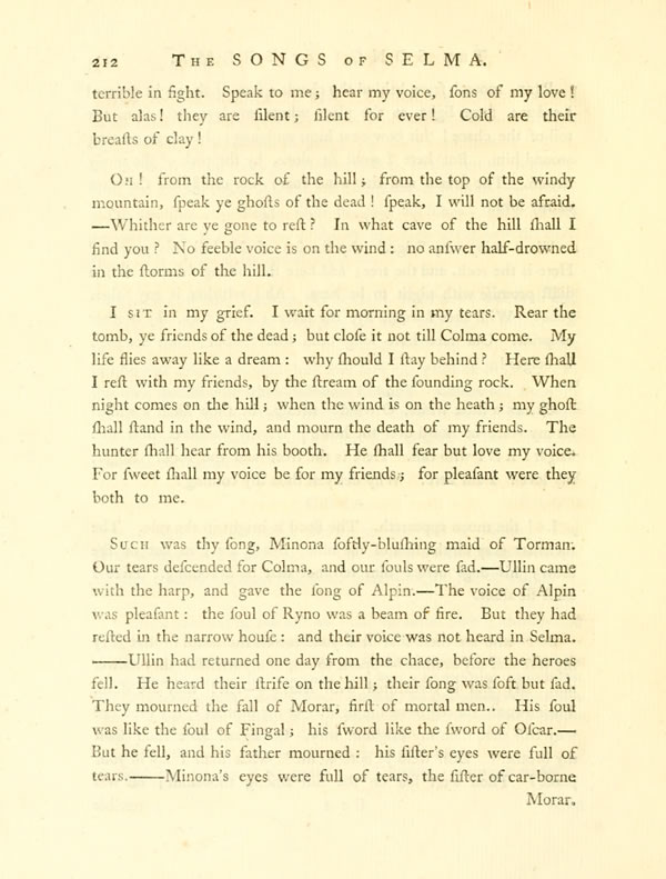 MinonaDisplay note came forth in her beauty; with down-cast look and tearful eye; her hair flew slowly on the blast that rushed unfrequent from the hill.——The souls of the heroes were sad when she raised the tuneful voices; for often had they seen the grave of SalgarDisplay note, and the dark dwelling of white-bosomed ColmaDisplay note. Colma left alone on the hill, with all her voice of music! Salgar promised to come: but the night descended round.—Hear the voice of Colma, when she sat alone on the hill!
