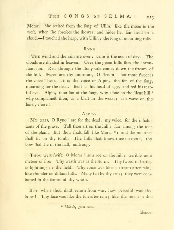 My tears, O Ryno! are for the dead; my voice, for the inhabitants of the grave. Tall thou art on the hill; fair among the sons of the plain. But thou shalt fall like MorarDisplay note; and the mourner shall sit on thy tomb. The hills shall know thee no more; thy bow shall lie in the hall, unstrung.
