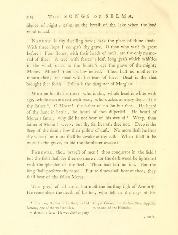 Narrow is thy dwelling now; dark the place of thine abode. With three steps I compass thy grave, O thou who wast so great before! Four stones, with their heads of moss, are the only memorial of thee. A tree with scarce a leaf, long grass which whistles in the wind, mark to the hunter's eye the grave of the mighty Morar. Morar! thou art low indeed. Thou hast no mother to mourn thee; no maid with her tears of love. Dead is she that brought thee forth. Fallen is the daughter of Morglan.