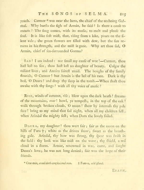Daura, my daughter! thou wert fair; fair as the moon on the hills of FuraDisplay note; white as the driven snow; sweet as the breathing gale. Arindal, thy bow was strong, thy spear was swift in the field: thy look was like mist on the wave; thy shield, a red cloud in a storm. Armar, renowned in war, came, and fought Daura's love; he was not long denied; fair was the hope of their friends.