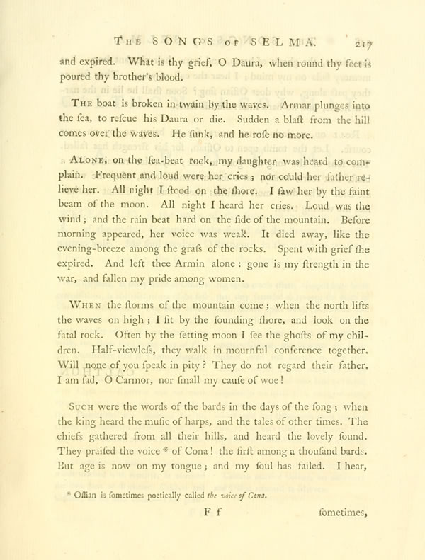 Alone, on the sea-beat rock, my daughter was heard to complain. Frequent and loud were her cries; nor could her father relieve her. All night I stood on the shore. I saw her by the faint beam of the moon. All night I heard her cries. Loud was the wind; and the rain beat hard on the side of the mountain. Before morning appeared, her voice was weak. It died away, like the evening-breeze among the grass of the rocks. Spent with grief she expired. And left thee Armin alone: gone is my strength in the war, and fallen my pride among women.