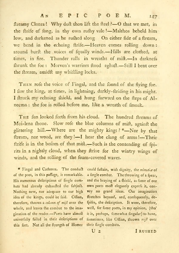 I rushed along. The grey mist rose.—Tall, gleaming, they flood at Lubar.—Cathmor leaned against a rock. His half-fallen shield received the stream, that leapt from the moss above.—Towards him is the stride of Fingal: he saw the hero’s blood. His sword fell slowly to his side.—He spoke, midst his darkening joy.